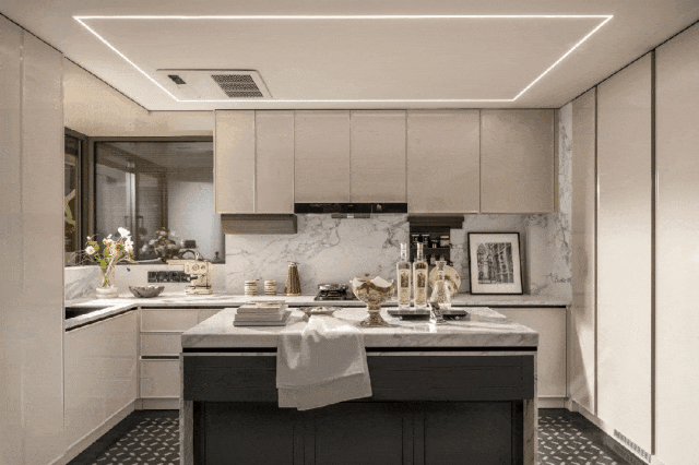 厨房更是拥有别墅级大空间,通铺中央空调、地段,甚至还有交付的奢石大岛台。