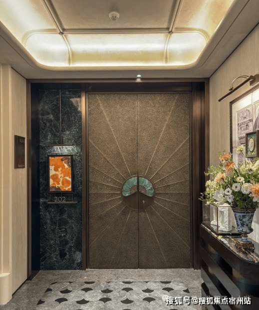 专属电梯厅归家,独立方正,极具 私密性。开启属于自己的入户序章。已开户型均配备了 铸铝装甲门,门把手为内嵌奢石的 扇形设计整体海派元素贯穿项目,密码锁也巧妙隐藏于扇面造型之后,当人手靠近,支持感应开启。 天花都用了肌理漆,简约却设计感十足。