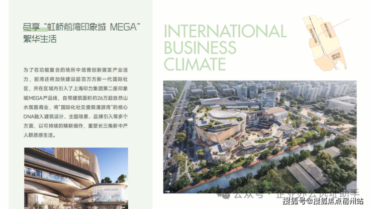 鸿桥国际商务中心位于上海市闵行区朱建路179号,是 虹桥前湾板块 的一个大型 商办综合体 ,由万科印力联合富士康开发,总建筑面积约40万㎡。它包含总部 独栋、商务花园办公和MERA前湾印象城商业体 ,主打“无界花园办公”理念,适合企业总部或研发办公。