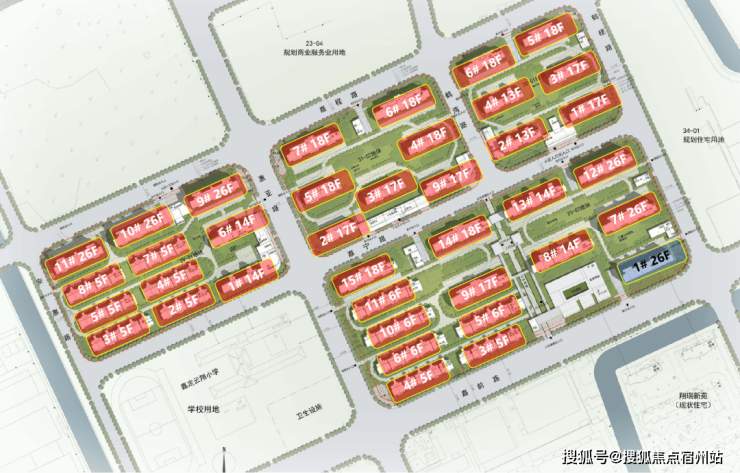 根据公示图显示,该项目的4个小板块最高层为项目东南角和西北角的26层高层,共有6栋,高度接近地块限高的80米(77.80米);18层的共有8栋;17层共有6栋;14层共有4栋;13层共有2栋;6层的共有4栋;5层的共有8栋。