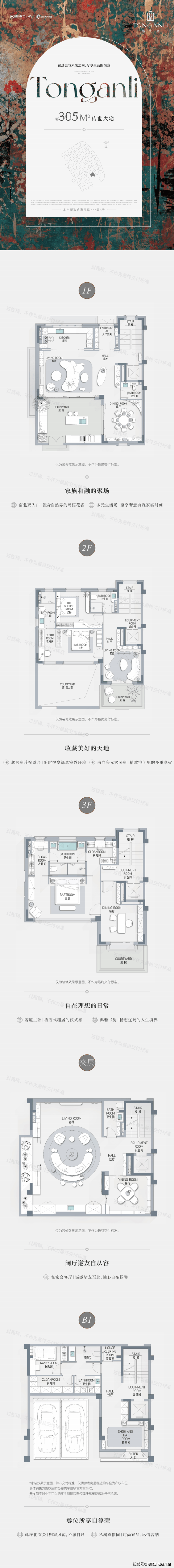 整盘仅有70套住宅,以建面约235-305㎡风貌联排别墅为主,搭配少量建面约185㎡叠加产品!