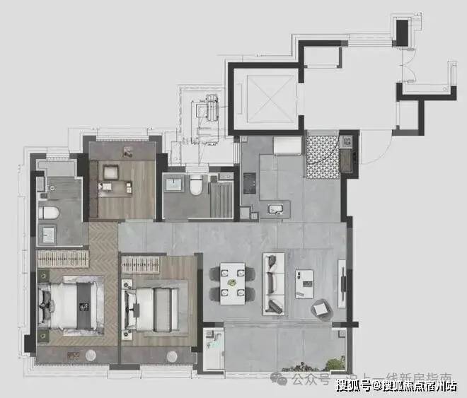 ②建面约103㎡3房户型:项目建面约103㎡3房同样是三开间+大横厅的布局,但在主卧尺度上更进一步,可以隔出一个大衣帽间和化妆间,让女主人释放买买买的天性!