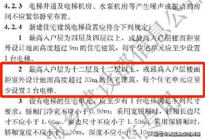 ② 5.1起执行住宅新国标,最高入户层为十二层及十二层以上,或最高入户层楼面距室外设计地面高度超过33m的住宅建筑,每个住宅单元应至少设置2台电梯。