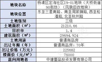 地块东至三星南路、上海中建壹品外滩元境官方售楼处电话:400-1185-086√√√【已认证】南至周家牌路,西至松潘路,北至杭州路,建设用地面积21210.66㎡,容积率1.4,地上计容建筑面积29694.92平方米,协议出让价格225682万元,楼面价约76000元/㎡。