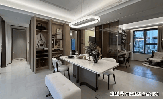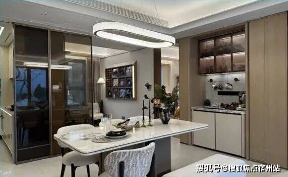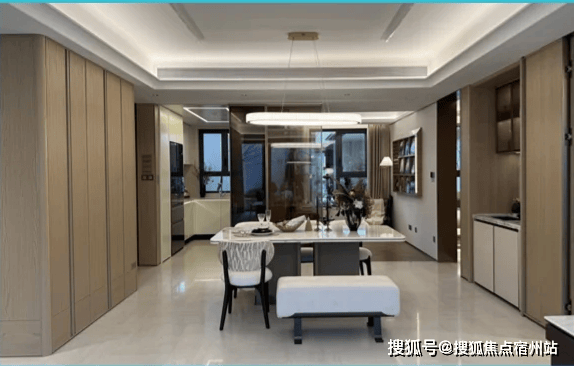 餐厅区域可轻松放置6人位餐桌,两侧还预留储物柜以及餐边柜空间 ,其实哪怕摆放一个8人位的大圆桌,也绰绰有余!