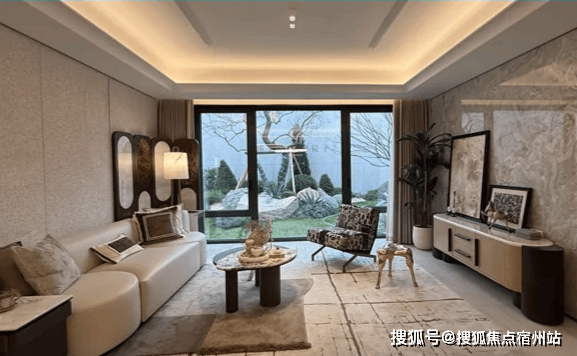 电视背景墙采用安第斯雪景仿奢石大块岩板 (融创外滩壹号院4000万+豪宅同款)+褶皱石材包边;