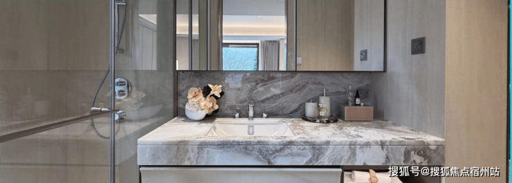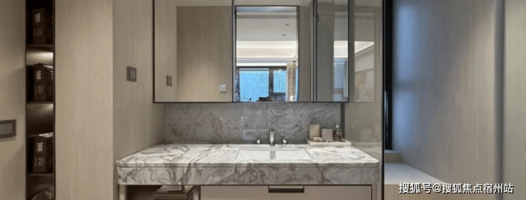 主卫墙面采用 大块防洞石岩板,石材地面,铝合金材质通顶镜柜,并内置美妆冰箱;
