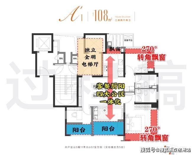 比如一梯一户+全明独立电梯厅+双阳台+南北270°转角飘窗。