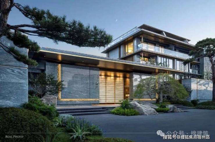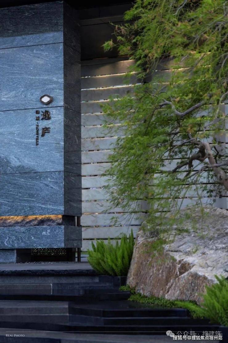 南大门以现代宋式美学为笔,库班灰石材镌凹槽光影,两侧沉稳如砚,温润玉石屏风透光藏景,轻钢飞檐承宋韵,悬挑一抹空灵。前庭孤树与奇石对望,转身水景铺陈,享影横波,归家动线于隐奢中完成由“雅境”至“松弛”的东方转场。搜建筑