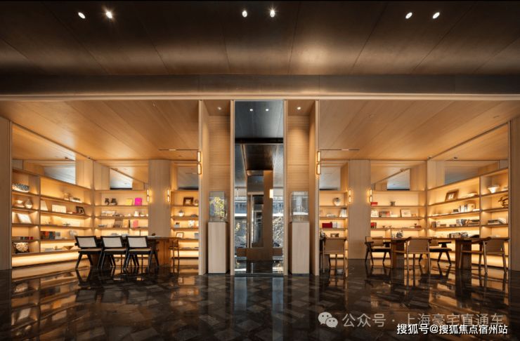 入口灰空间吊顶,通过逐次的叠级,宛若一枚稀世宝匣缓缓开启,瞬间倾泻出温润如玉石般的光泽。基座石材选用了横向自然纹理强烈的库班灰,借用他的这种纹理气质营造一副烟雨江南的图卷,愈发衬托出上方玉构悬浮于空灵的东方意境。搜建筑