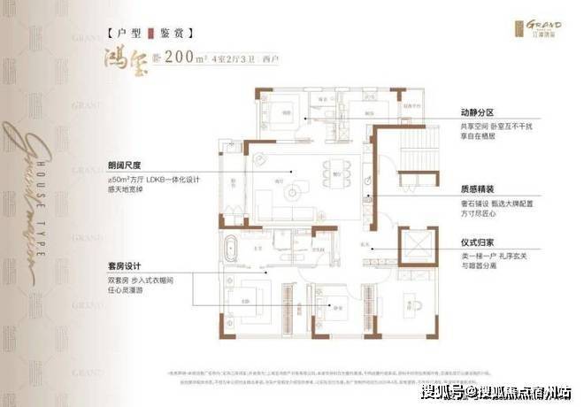 户型为建面约200㎡4房3卫大平层。