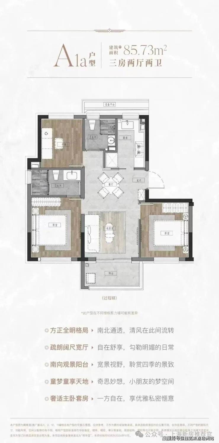 区别于市面上80多平2房或3房1卫, 该户型做出了3房2卫的格局,功能性拉满 ,满足三代同堂/二胎家庭共居。