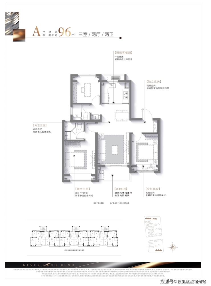 建面约100㎡的三房两厅两卫户型,可以说是约96㎡3房的升级版,空间更加延展,整体 横厅面宽约5.2米(轴中距),形成更大的南向采光面,且搭配南向观景阳台,直接做到了 3.5面宽朝南,这在同类产品中是比较少见的。