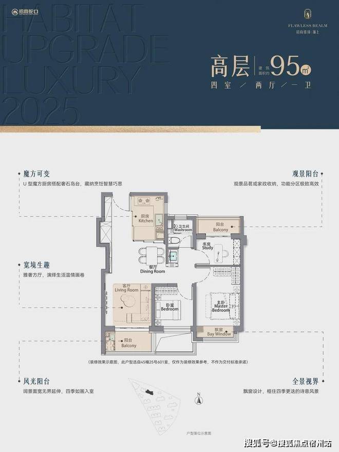 再加上南向大面宽短进深、全卧飘窗、L型转角阳台设计,哪怕小户型95㎡3房,尺度感都超棒,采光和视野更是一流。