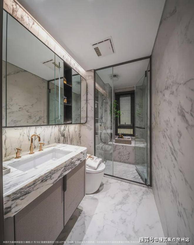 卫生间墙面采用大面积岩板,台盆柜处定制镀金龙头;另外超大镜面柜内配置了充电口,方便剃须刀、电动牙刷等工具收纳。