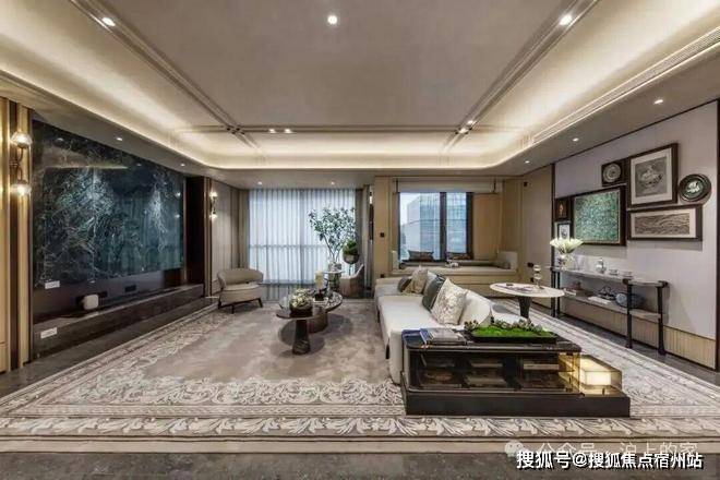 在装饰细节上,从天花板的曲面吊顶、墙体的圆角过渡,到定制家具的流畅线条,都在诉说喜曲不喜平的优雅,天花吊顶,更有刻槽工艺,融入项目logo,赋予业主独一份的尊崇。