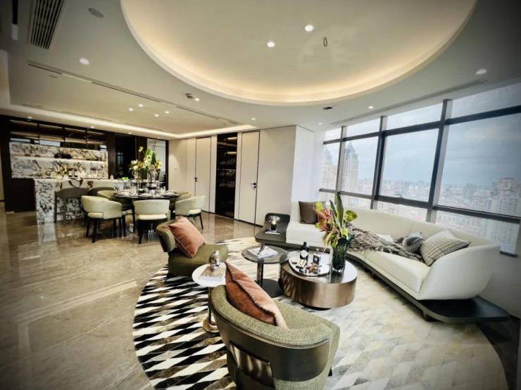 所在楼层,高耸入云。躺在床上即可饱览上海“一江一河”的经典地标,睁开眼睛即可感受到内环老城厢的闹忙、烟火气……在家就能看陆家嘴三件套的日出日落、苏河湾上工作游船的来往如织。